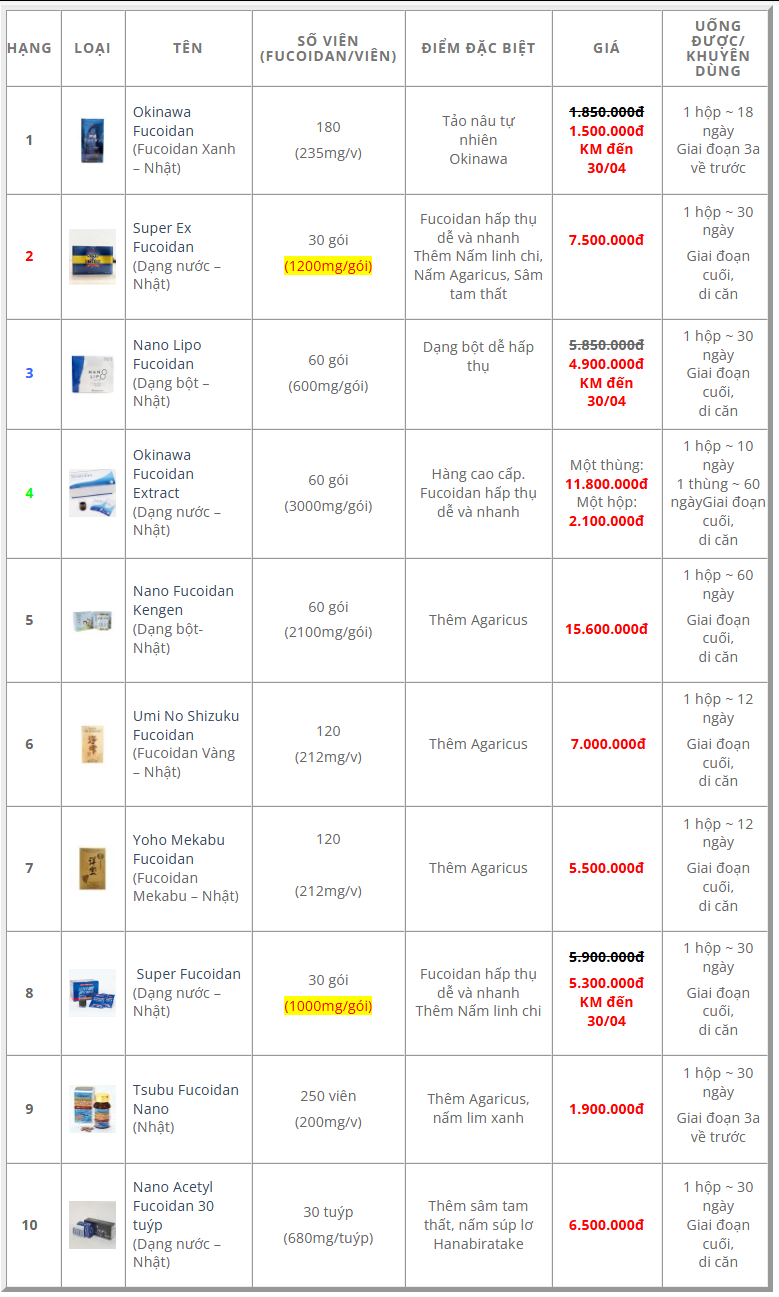 Xếp hạng Fucoidan Nhật Bản được nhiều người dùng tháng 03/2026