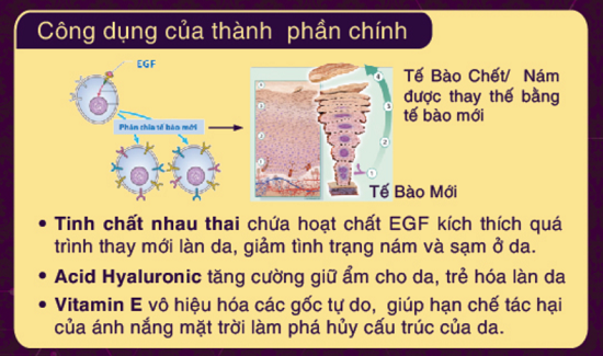 + Tinh chất nhau thai heo chứa EGF tự nhiên (Yếu tố tăng trưởng ngoại bì): Hoạt chất E.G.F được tìm thấy nhiều trong nhau thai được xem là yếu tố kích thích quá trình phát triển các tế bào ở da diễn ra nhanh hơn, góp phần giảm các biểu hiện sạm và nám, mang lại vẻ mịn và hồng tự nhiên cho làn da.